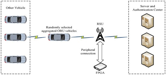 As shown in Figure 2, the entire scheme is illustrated. While vehicles are driving on the road, they collect information, which is then aggregated by a randomly selected vehicle responsible for gathering the aggregated information, and subsequently sent to the RSU. The RSU initially processes the information using its CPU before passing it to the attached FPGA device for further processing. After the FPGA processes the information, it is sent back to the CPU for final processing. Once the RSU has processed the information, it is fed back to the vehicle cluster and the server. This scheme is an improvement based on the systems described in references [,]. The processes of system establishment, master key generation, vehicle registration, and key distribution are the same as those in the aforementioned references. The following sections will describe the main parts and the improved processes, including the sign, single signature verification, aggregate signature generation, and aggregate signature verification.