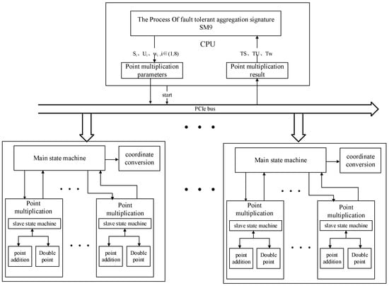 The overall structure of the hardware acceleration for the efficient SM9 aggregate signature scheme is shown in Figure 3. The architecture consists of a CPU connected to multiple FPGA boards with information exchanged via the PCIe bus. The CPU is responsible for bilinear pairing operations involved in the SM9 algorithm, the configuration of parallel point multiplication parameters in SM9, and the final verification of the results. The FPGA boards are responsible for parallel acceleration of the point multiplication operations.