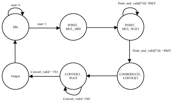 As illustrated in Figure 3, a master state machine is set up to control the data flow within each point multiplication unit and handle the subsequent processing of the computation results. The state transition diagram of the master state machine is shown in Figure 4.