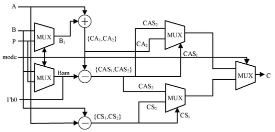 To optimize the use of on-board resources and reduce the area, modular addition and subtraction are implemented in a combined manner using pure combinational logic. This module performs calculations based on the initial input modulus and mode selection . Since modular addition can result in overflow and modular subtraction can result in negative outcomes, these situations need to be handled accordingly. The optimized computation method is shown in Algorithm 2.