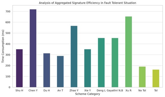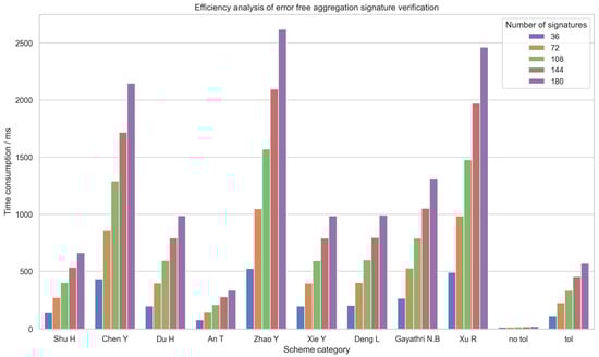 In our work, we construct a fault-tolerant aggregate signature set . Each has a size of . Once we have constructed the fault-tolerant set, for convenience of representation, we denote it using to represent the corresponding . Additionally, we can observe that each individual signature appears twice in different . Given that , we can infer from Equation (20) that the number of single signatures in the intersection of any two subsets is 1. Therefore, we can conclude that the two erroneous signatures will appear in three or four different subsets. In our analysis, we consider the worst-case scenario where the two erroneous signatures appear in four different subsets. Thus, only five subsets pass verification. Consequently, the number of correct signatures passing verification can be calculated using Equation (19), yielding . Therefore, a total of 30 signatures pass the verification. In error handling of aggregate signature, the method of independent verification after error is generally adopted. Below, we provide a brief explanation of the number of individual verifications required for non-fault-tolerant aggregate signatures. When two erroneous signatures are mixed into 36 signatures, assuming the probability of encountering the first erroneous signature at position is uniform, we denote its position as . The probability of the second erroneous signature being at position is . Therefore, the expected number of verifications is approximately 21. In contrast, the maximum number of verifications required for fault-tolerant aggregate signatures is six. Hence, the fault-tolerant aggregate signature scheme demonstrates better performance in the presence of erroneous signatures. Figure 8 presents the efficiency analysis of fault-tolerant aggregate signatures, where “no tol” represents the verification time in the non-fault-tolerant mode, and “tol” represents the consumption time in the fault-tolerant mode. Below, we provide more specific data: in this scenario, the time to verify and identify all erroneous signatures is 351.611 ms for [], 720.25 ms for [], 313.862 ms for [], 289.833 ms for [], 567.39 ms for [], 351.632 ms for [], 455.315 ms for [], 455.354 ms for [], and 653.782 ms for []. The non-fault-tolerant aggregate mode takes 191.206 ms, while the fault-tolerant aggregate mode takes 163.97 ms. In the current scenario, analyzing the time taken by each scheme, our proposed scheme, whether in fault-tolerant or non-fault-tolerant aggregate mode, significantly outperforms other non-fault-tolerant schemes. Even compared to the fault-tolerant scheme in [], our scheme’s time consumption is only 28.9% of theirs. In summary, our designed scheme shows a substantial advantage in both fault-tolerant and fault-free scenarios.