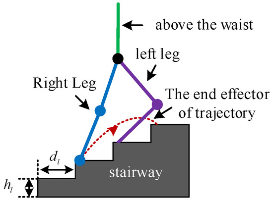 Structured terrain is the most common type of terrain encountered in human daily life, comprising flat ground, stairs, and ramps. To ensure safe and smooth movement of an LLERR in these environments, it is crucial to plan a reasonable gait. This paper aimed to adapt the LLERR to the staircase environment by designing and planning the LLERR’s joint motion trajectories. Figure 1 shows the LLERR’s terrain environment, with a step height of and a depth of .
