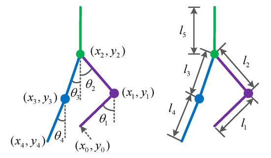 Figure 2 shows the LLERR on a staircase, with the left leg on a higher step and the right leg on a lower step. In order to describe the robot posture, a five connecting rod model is used, and the angles and parameters are defined. The angle between the left shank and the vertical is , the angle between the left thigh and the vertical is , the angle between the right thigh and the vertical is , and the angle between the right shank and the vertical is . The angle is defined as 0 degrees when the thigh (shank) overlaps with the vertical. Clockwise rotation is considered positive, while counterclockwise rotation is considered negative. The left shank has a length of and a mass point of . The left thigh has a length of and a mass point of . The right thigh has a length of and a mass point of . The right shank has a length of and a mass point of . The upper torso has a length of and a mass point of .