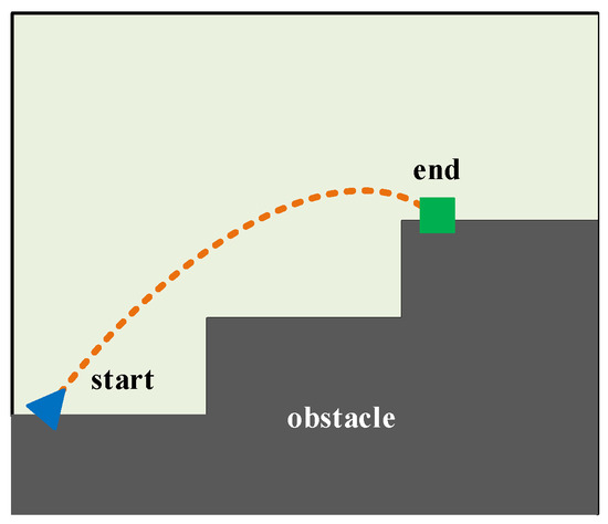 The aim of this subsection was to plan a reasonable motion path for the mass point U located at the right-foot sole. Therefore, we focused solely on the right-foot sole of the LLERR and disregarded the other parts. To better analyze the motion path of the mass point U, we established a grid map, as shown in Figure 3. The map illustrates the path that the mass point U takes, departing from the start, avoiding obstacles, and reaching the end along a shorter and smoother path. To achieve this goal, we used the TD3 algorithm in this subsection.