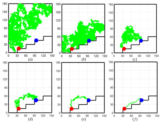 As shown in Figure 6 for the path planning process of the TD3 algorithm, initially, due to the lack of a priori knowledge, only the global exploration strategy could be used. This resulted in the LLERR struggling to find the end point, as shown in Figure 6a. However, with the passage of time and the accumulation of experience from a series of failures, the system gradually learned an effective path planning method and eventually succeeded in finding the end point, as shown in Figure 6b. After accumulating successful experiences, the system gradually optimized the planning of the movement path, resulting in shorter and more reasonable paths as shown in Figure 6c–e. After 2000 iterations of learning, the algorithm successfully planned a shorter, smoother, and more reasonable motion path. This path could initially be considered a target curve for subsequent LLERR control. It provided feasibility and guidance for the system to exhibit superior motion planning in applications. The result is shown in Figure 6f.