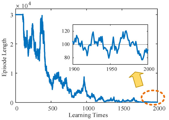 According to the learning stage of the TD3 algorithm shown in Figure 7, the relationship between the planning path length and learning times of mass point U, in the initial stage, due to the lack of experience, was not able to find the end point in 30,000 runs, which meant that the system was in the blind exploration stage and needed to carry out a wide exploration of the whole map. However, once the end point was successfully located, the LLERR began to accumulate experience in reaching it and entered the stage of searching for the optimal path. As successes accumulated, the length of planned paths tended to decrease. After approximately 2000 learnings, the length of the planned path stabilized at around 100 processes. This shows that the accumulation of experience and the optimization of the system make the search for the optimal path more efficient and stable.