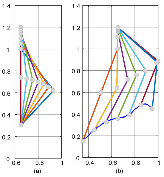 Figure 11 shows the schematic diagram of LLERR completing a stride. One cycle was 2 s. Figure 11a shows the movement process of the left leg, where the left sole’s position remains constant, and the knee contracts backward while the hip extends upward. Figure 11b shows the movement process of the right leg, where the sole is on the ground, and the leg is straight. Then, the sole gradually leaves the ground, and the knee starts to bend forward while the hip extends upward. The right and left legs move together to complete a single stride cycle.
