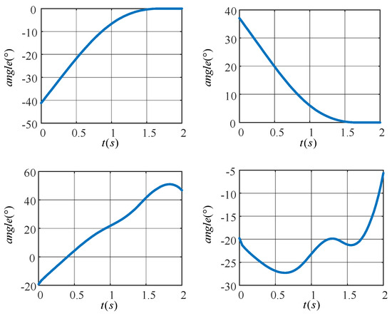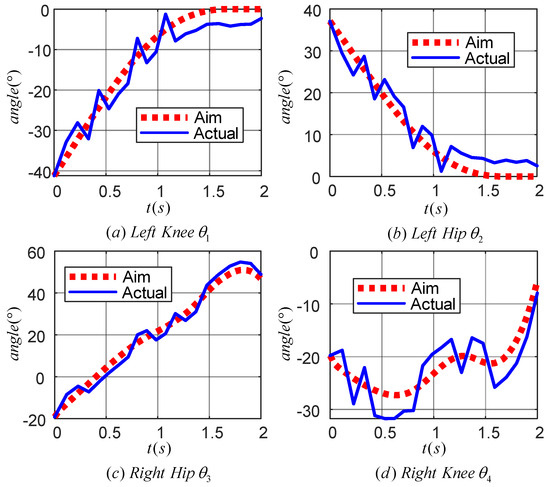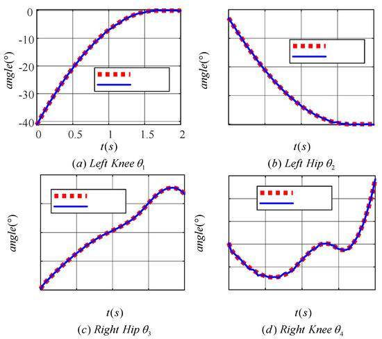 In Figure 12a,b, the target motion trajectories of the knee (hip) joint of the left leg are shown. The angle of the knee joint gradually increases to zero degrees while the angle of the hip joint gradually decreases to zero degrees as the left leg is shifted from a flexed state to an upright state. Figure 12c,d show the target motion trajectories of the knee (hip) joint of the right leg, which completes the movement up the stairs. The angle of the hip joint tends to increase, while the angle of the knee joint increases in a spiral fashion.