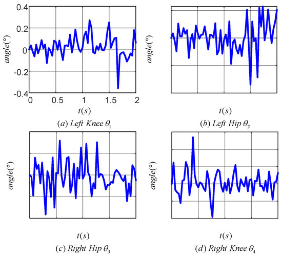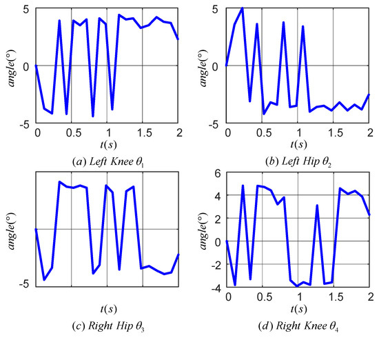 Figure 14 illustrates the tracking error of the TD3 algorithm for controlling the angle of the lower limb joints. Plots (a), (b), (c), and (d) correspond to the tracking errors of the left knee, left hip, right hip and right knee joints, respectively. The maximum tracking error was within 0.4° for the left knee, 0.4° for the left hip, 0.2° for the right hip, and 0.6° for the right knee. The results indicated that the TD3 algorithm was effective in reducing the angular tracking error of each joint of the LLERR. This demonstrated the TD3 algorithm’s efficacy from an error analysis perspective.