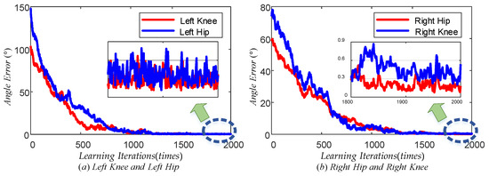 Figure 15 illustrates the maximum tracking error trend of the TD3 algorithm for the left knee, left hip, right hip, and right knee during the learning phase. The red line represents the maximum tracking error of the left knee, while the blue line represents the maximum tracking error of the left hip in plot (a). Similarly, the red line represents the maximum tracking error of the right hip, while the blue line represents the maximum tracking error of the right knee in plot (b). Observing these plots, it can be concluded that all four curves exhibited a decreasing trend from a global perspective. This indicated that the maximum tracking error of each joint angle gradually decreased as the number of learning times increased. From a local perspective, the trend of decreasing the maximum tracking error for each joint became slow once the number of learning times reached a specific threshold. Specifically, following 1800 learning sessions, the maximum error was stabilized at approximately 0.4° for the left knee, 0.5° for the left hip, 0.2° for the right hip, and 0.6° for the right knee. When the number of learning iterations was less, the blue line in both (a) and (b) plots showed an increasing trend, which indicated that the learning direction of the left hip joint and the right knee joint was not accurate enough at the beginning of learning due to the lack of experience, but with the accumulation of experience, the learning direction was gradually adjusted to the correct direction. The above results demonstrated that the TD3 algorithm could effectively reduce the error of the LLERR after multiple learning iterations. This proved the effectiveness of the TD3 algorithm from the learning process.