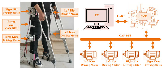 Figure 16 shows the experimental prototype test platform of the LLERR. We invited a volunteer with a height of 165 cm, weight of 65 kg, shank length of 43 cm, and thigh length of 47 cm to climb a staircase with a height of 15 cm per step in the experimental environment. The parameters of each drive motor of the LLERR were as follows: the hip joint drive motor had a rated speed of 27 PRM, a rated torque of 133 N∙M, and a peak torque of 194 N∙M; the knee joint drive motor had a rated speed of 35 PRM, a rated torque of 107 N∙M, and a peak torque of 169 N∙M. The encoder resolution was 17 bits. The entire prototype platform was powered by a 48 V supply voltage, and the CAN bus was used for communication. The bottom motor drive control core was an STM32F407, and the upper TD3 algorithm running platform was a PC (Intel i7).