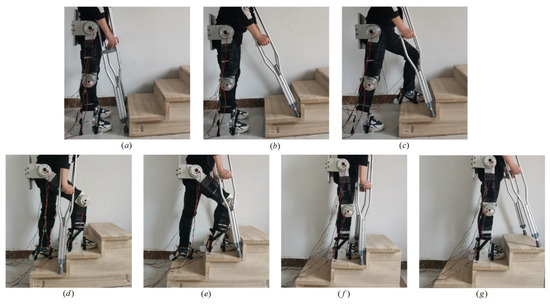 Figure 17 shows the testing process of the LLERR prototype. Plot (a) shows the volunteer wearing the LLERR lower limb exoskeleton with upright legs and holding double crutches as the initial state. Plot (b) shows the volunteer adjusting the position of the crutches, then the LLERR starting to plan the motion trajectory of the left-foot sole and backpropagating the target angle profile of the left (right) hip (knee) joint. Plot (c) shows the LLERR running the TD3 algorithm to control the left leg to complete the movement of the previous step, then planning the movement trajectory of the right-foot sole and backpropagating the target angle curve of the left (right) hip (knee) joint. Plot (d) shows the LLERR running the TD3 algorithm to control the right leg to complete the movement of the previous step. Plot (e) shows the crutches moving one step and next, the LLERR planning the trajectory of the left-foot sole and inversely extrapolating the target angle profile of the left (right) hip (knee) joint. Plot (f) shows the LLERR running the TD3 algorithm to control the left leg to complete the movement of the previous step. Plot (g) shows the crutch moving one step and the test completing.