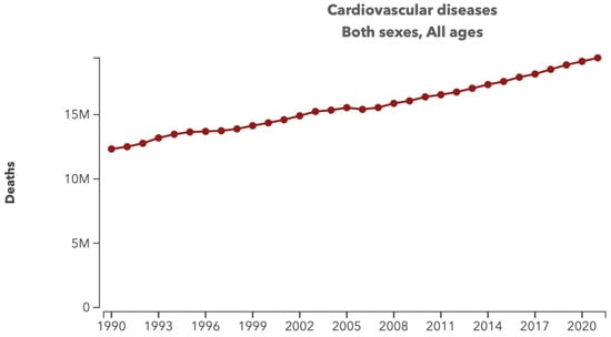 Number of deaths due to cardiovascular diseases, 1990–2021. Source: Institute for Health Metrics and Evaluation (IHME). GBD Compare Data Visualization. Seattle, WA: IHME, University of Washington, 2020. Available online: https://vizhub.healthdata.org/gbd-compare/ (accessed on 18 May 2024).