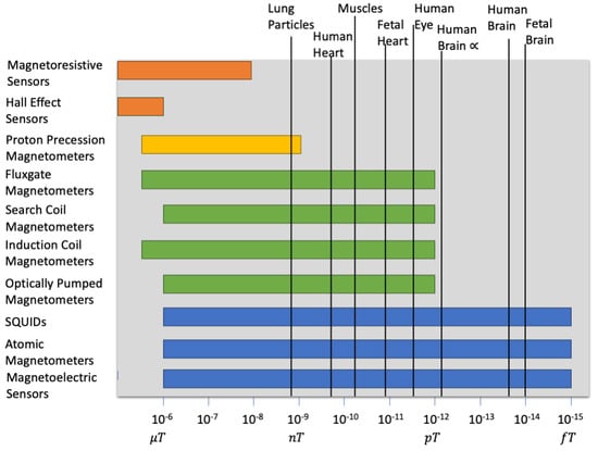 - Applications: They are used in neuroimaging and magnetoencephalography (MEG) [54,55], magnetocardiography (MCG), Muscle Activity Monitoring (Magnetomyography, MMG) [56], and medical imaging (MRI and NMR) [55].