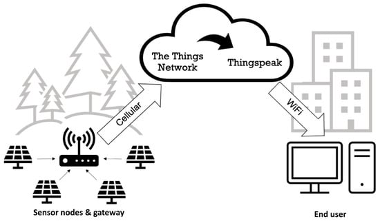 LoRaWAN was selected as the wireless networking protocol for local communication between sensor nodes and the gateway, as this protocol is low-power, long-range and supports a high network capacity []. Low-cost LoRa-compatible devices are also widely available on the market. Sigfox is the only comparable wireless network, in terms of range and power consumption, but network coverage is managed by the Sigfox company (Labège, France) and remains incomplete in remote regions [,].