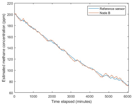 Estimated methane concentration from the trained models for the reference sensor and the Node B field sensor during the pre-deployment calibration experiment.
