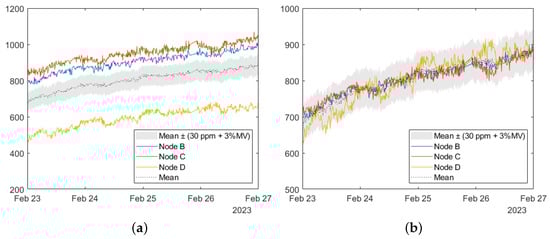 The CO2 sensors were calibrated relative to one another during the same experiment as the methane sensors. The sensor nodes were co-located in a vacuum chamber for 4 days and the CO2 sensor outputs were recorded (Figure 5a). The mean from the sensors was calculated and a scaling factor relative to this mean was applied to the output from each sensor. This brought the variability between sensors to within the manufacturer’s stated deviation, 30 ppm + 3% of the measured value (Figure 5b).