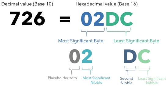 To reduce airtime and power consumption, a novel datastring encoder was devised. Contrary to the default approach of encoding data as hexadecimal bytes, this encoder uses nibbles—i.e., individual hexadecimal digits. For example, in a standard system, if the maximum value reported by a sensor is 726, in hexadecimal notation, this would usually be encoded across 2 bytes as “02DC”. The issue with this approach is that the first digit is never used but is always transmitted as “0” (Figure 6). The system described below removes this issue, thereby reducing transmission length.
