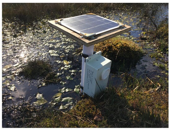 IoT networks are typically implemented in several layers: Things, Gateways, Edge Computing and the Cloud [,]. At the most physical layer, Things, or “nodes”, record measurements or interact with their environment. As sensor nodes are often small low-power devices, the long-range transmission of data payloads is handled by the next layer: gateways. These are devices that handle communication in a local area, much like WiFi routers. This system architecture offers a number of benefits in the context of collecting data in remote environments, such as peatlands. Human presence at the deployment site is only required during deployment, repair visits, or retrieval of the system; data are collected and transmitted autonomously, and improved temporal and spatial resolution can be achieved without increasing labour.
