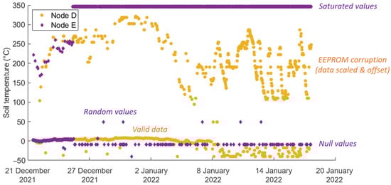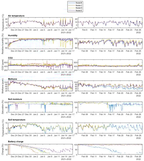 For the December 2021–January 2022 period, sensor node D was located within range of the gateway (labelled “Jan D” in Figure 1). To test the offline functionality, for the February 2022 period, the node operated in offline mode in the new Easternmost location (labelled “Feb D” in Figure 1), recording data on the local EEPROM rather than transmitting to the gateway.