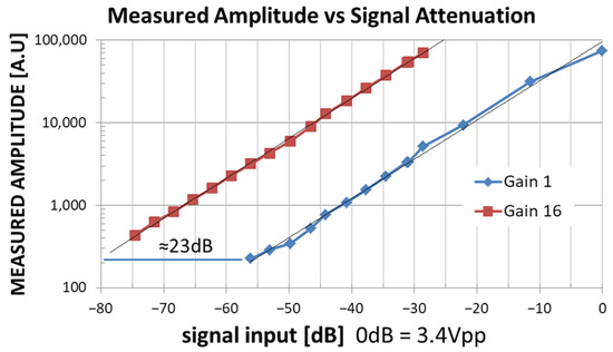 Figure 7 displays the Measured_Amplitude vs. the Signal Input Level at two PGA Gain settings (Gain = 1 blue line and Gain = 16 red line). The horizontal distance between the two interpolating lines is about 23 dB, very close to the theoretical value of 20∙log10(∆Gain = 16) = 24 dB. As shown in Figure 7, considering the use of the PGA, the DSP Box Due LIA provides coherent measurements in the input range from 0 dB = 3.4 Vpp to −75 dB ≈ 0.60 mVpp, which can also be considered a good result in relation to the low cost of the DSP Box Due. In fact, in the current version, the input bandwidth of the LIA is limited by the sampling rate to 2.5 kHz, while the maximum measurement output rate is 10 sps; however, this is not a limitation for our applications.