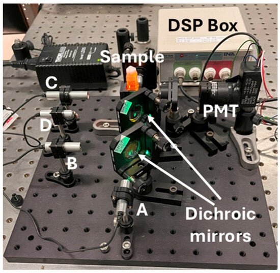 Inspired by these satisfactory results, a simple compact setup for sensing through fluorescence quenching was implemented (see Figure 11) based on the same cheap 5V-supplied laser diode (A) and a 5V-supplied photomultiplier (PMT, H10723-20, Hamamatsu Photonics K.K.). Three additional 5V-powered laser diodes (B, C, and D) with different emission wavelengths were incorporated for further tests, as will be discussed below.