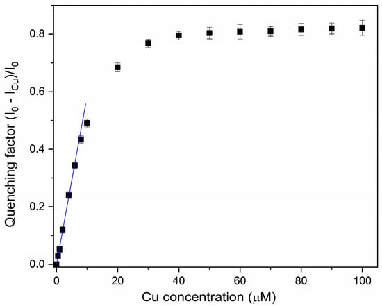 Calibration plot showing fluorescence quenching vs. Cu(II) concentration over the range 0–100 μM. Black squares represent experimental data while the blue line is a guide for the eye showing the linear beahaviour at low concentration. Error bars represent ±SD.