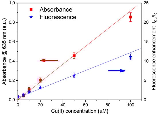 Calibration plot showing fluorescence enhancement (blue stars) and the increase in absorbance (red squares) of NSCDs upon the addition of Cu(II) at different concentrations in the range 0–100 μM. Error bars represent ±SD.