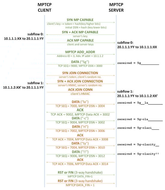 MPTCP message exchange assuming, as an example, two network interfaces on the client and one network interface on the server. Sublow 0 is shown in green, while sublow 1 is shown in orange.