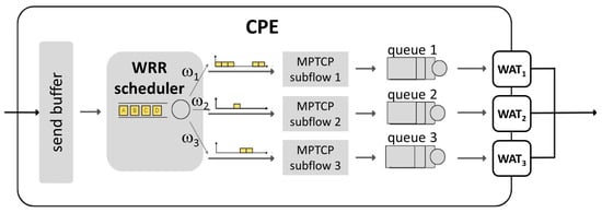 Figure 2 shows the operation of the WRR scheduler for the framework proposed in Section 6.1. As shown, the application at the Customer Premises Equipment (CPE), i.e., the device transmitting with the different WATs, generates packets which are sent to the connection-level shared send buffer. Then, the scheduler decides which subflow queue to forward the next packet to based on the dynamically assigned weights.