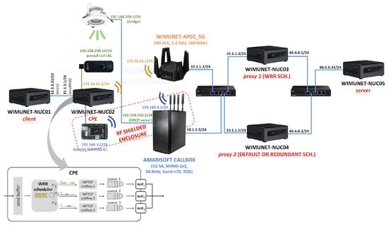 The topology is shown in Figure 3. The five Intel NUCs had i7 processors with 16 GB of RAM and SDDs of 512 GB. The CPE (Customer Premises Equipment) included an Intel AX201 Wi-Fi 6 network card, a Quectel RM500Q-GL as a 5G modem, and the aforementioned LiFi-X USB dongle.