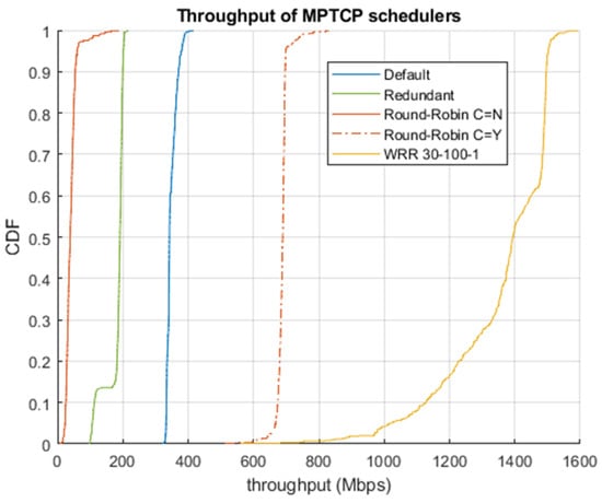 Regarding the performance of the MPTCP schedulers, the default and redundant schedulers are not designed to maximize throughput but to reduce latency and, in the case of the latter, improve reliability. For this reason, their throughput—which depends not only on the performance of each individual WAT but also on the temporal evolution of their congestion windows due to the HoL problem—was low in these experiments, achieving an average of 181 Mbps and 348 Mbps, respectively. In the case of the Round-Robin test, the performance strongly depends on the CWND_LIMITED parameter. If it is set to “N”, then a perfect Round-Robin policy is executed, so all interfaces transmit the same number of packets. This means that the slowest interface limits the rest. For that reason, the achieved throughput was very poor (41.1 Mbps on average, which is approx. 3 times the throughput of LiFi). If CWND_LIMITED is set to “Y”, the scheduler tries to fill the congestion window of each subflow, thus increasing the performance to approx. 690 Mbps.