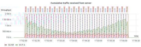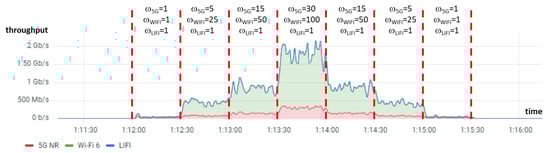 However, using our WRR scheduler with the appropriate weights, we were able to achieve the maximum aggregated throughput. As commented in Section 5, we computed the weights to be approx. proportional to the data rate of each WAT: , , and , with 5G configured for maximum throughput, and , , and , with 5G configured for minimum latency. As shown, the throughput varies between 1 and 1.5 Gbps for the first case, with an average of 1.36 Gbps (roughly the sum of the averages of 5G, Wi-Fi, and LiFi and almost doubling that of RR), and around 200 Mbps less for the second case (due to the lower performance of 5G low latency).