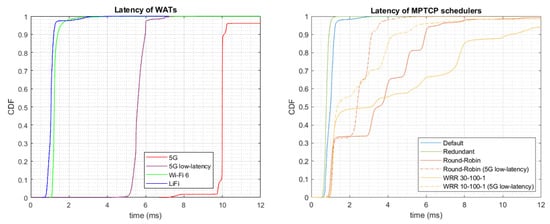 Figure 7 presents the latency of the different WATs and the different MPTCP schedulers. As shown, the one-way latency of LiFi and Wi-Fi was around 1 ms (1.08 ms and 1.28 ms on average, respectively), increasing to 10.1 and 5.6 ms for 5G and 5G low latency, respectively.