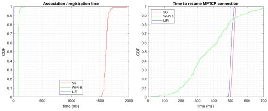 In this subsection, we evaluate the time to resume the transmission when a new link becomes available, e.g., after crossing an area without coverage. It is noteworthy that the three WATs exhibit very different coverage footprints, which implies that intermittent coverage situations may arise, particularly for LiFi.
