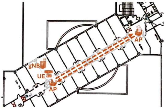 For these reasons, we chose to conduct an experiment in which the mobile device was placed near the gNB (which is an indoor unit for laboratories) and the Wi-Fi access point was moved away, attempting to emulate the indicated radio conditions. Since the mobile device was assumed to be moving during the experiment, LiFi was not considered. Figure 9 shows the layout of the location where this experiment was conducted (at the Higher Technical School of Computer and Telecommunication Engineering of the University of Granada), including the movement of the Wi-Fi access point. The length of the round trip route was approximately 50 m, which was covered at a steady pace in 4 min and 10 s.