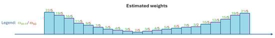 In order to obtain the capacity of the different WATs, we first executed periodic probes every 10 s using the iperf3 tool with a duration of 5 s and 10 parallel flows. These probes used normal TCP to avoid being affected by MPTCP. It is left for future work to estimate these capacities based on radio or network KPIs using methods such as Machine Learning. As an initial validation, we conducted another iperf connection of 5 s using MPTCP with the WRR scheduler after each probe. As shown in Figure 10, the throughput achieved with WRR and these weights (in the blue discontinuous boxes with labels “WRR”) closely matched the throughput measured during the probes (in the red discontinuous boxes with labels “PROBE”). Figure 11 includes the weights estimated during the probes—proportional to the estimated WAT capacities—which will be used in the next experiment. The height of each step is proportional to the ratio between the weights for Wi-Fi and 5G. For simplicity, capacities were rounded to the nearest 10 Mbps when estimating weights.