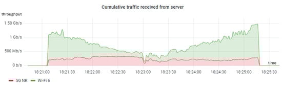 For Wi-Fi, our testbed included a Xiaomi AX9000 access point, which is IEEE 802.11ax-compliant, working with MU-MIMO 4x4 and a bandwidth of 160 MHz, allowing a peak data rate of 4804 Mbps. Using this bandwidth involved operating in the 5.2 GHz band, which minimized interference from nearby Wi-Fi access points. Additionally, since the experiments were conducted at the Higher Technical School of Computer and Telecommunication Engineering at the University of Granada, interference from residential Wi-Fi signals was minimal due to the school’s size and geographical location. However, to further reduce potential interference, including from the ETSIIT’s own access points, the experiments were carried out in the evening, when network traffic was lower and, consequently, interference was reduced.