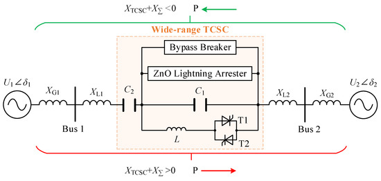The wide-range TCSC consists of a traditional TCSC in series with a group of capacitors and includes six main parts: two groups of capacitors, one reactor, one group of bi-directional thyristors, one ZnO lighting arrester, and one bypass breaker, as shown in Figure 1. In this case, the positive or negative of the sum of the reactances between the two sources determines the flow of power.