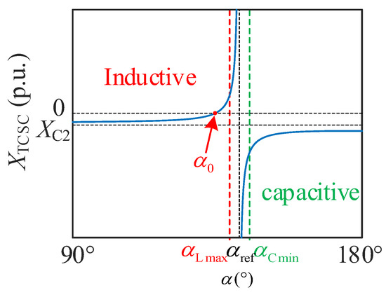 where is the angular frequency under the practical operation condition, is the trigger angle of thyristors. The change curve of with under the industrial frequency is shown in Figure 2. Wherein, and are the trigger angles corresponding to when and when the wide-range TCSC generates resonance, respectively.