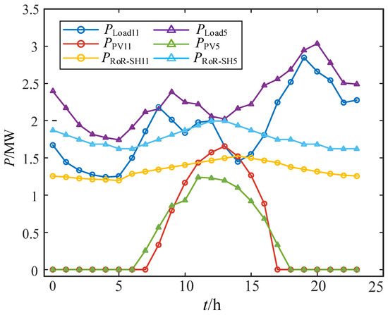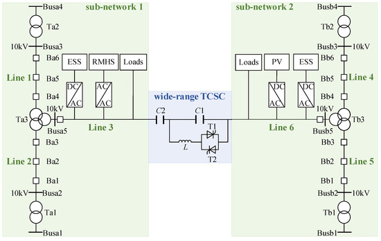 In each T-shaped sub-network, three 10 kV AC lines are linked together through a three-winding transformer. Wherein the ends of two AC lines are respectively connected to two 10 kV buses that belong to the substations of the 110 kV/220 kV main grid. And branches of the above two AC lines can be used for serving power users. The remaining AC line is used to connect the wide-range TCSC for the connection between two sub-networks. Meanwhile, it also takes charge of integrating DGs, ESSs, and loads. As shown in Figure 4, this paper studies the case that RoR-SHs and PVs are severally integrated in sub-network 1 and in sub-network 2. Also, both Line 3 and Line 6 are equipped with respective ESS.