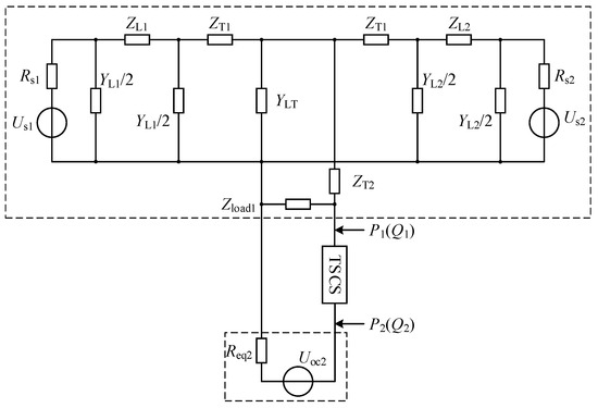 According to Thevenin’s theorem, the proposed ADN of Figure 4 can be equated to a double-generator power system as shown in Figure 5. Therefore, the proposed wide-range TCSC analysis can be applied to the proposed ADN.