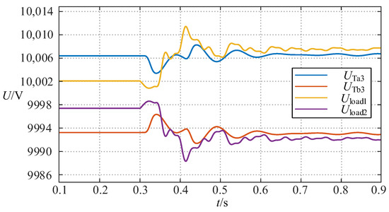 The simulation result of the above process is shown in Figure 6, in which P1 Q1 and P2 Q2 are the active and reactive power on the left and right sides of the TCSC, respectively. It can be seen that the wide-range TCSC functions of power inversion can be well implemented. Figure 7 proves that the variations of the load voltage Uload1 and Uload2 on the line where the TCSC is located and the voltage UTa3 and UTb3 on the third winding sides of the three-winding transformers are always within the permissible voltage fluctuation range during the above process.