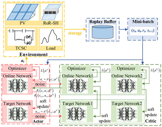 Based on the above MDP model, the above hydropower-photovoltaic-ESS complementarity optimization operation strategy model can be transformed into a DRL framework so that it can be solved using DRL algorithms. In this section, we introduce a TD3 algorithm, which is an advanced policy gradient algorithm for solving continuous action control issues, to solve the optimization operation problem of the proposed ADN.