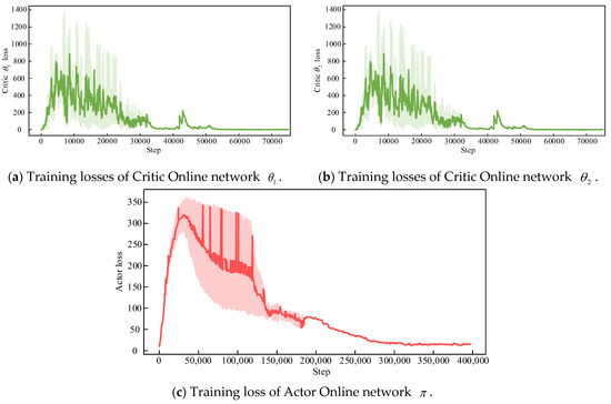 The loss functions of the three neural networks, the Critic Online network and , and the Actor Online network that need to be trained in TD3, are shown in Figure 13. The dark curve is the result of smoothing the true light curve. It can be seen that these training loss values are towards convergence after several steps, indicating that good value judgments and action decisions have been learned to make.
