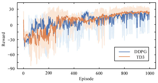 In Figure 14, the training rewards are depicted, with the light-colored curves representing the real reward values under random initial value settings of network parameters, while the darker curve shows the average reward per episode. Initially, the rewards per episode are low, indicating that the training is receiving negative rewards and episodes are cut short. This early phase reflects the DRL algorithms’ exploration of the environment and the lack of effective optimization strategies. As training progresses, the algorithm improves through interaction with the environment, leading to longer episode durations. After 600 episodes, the duration of each episode reaches 24 h with minimal fluctuations, demonstrating that effective strategies have been learned to maintain safe and stable operation without exceeding limits. It can also be seen from Figure 14 that the TD3 algorithm used in this paper achieves more convergent results and higher reward values compared to the DDPG algorithm.