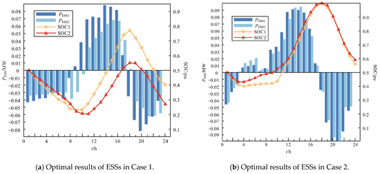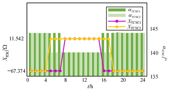 The optimization results over a 24 h period are shown in Figure 15 and Figure 16. Specifically, Figure 15a,b display the active power outputs and SOCs of the ESSs for Case 1 and Case 2, respectively, and Figure 16 illustrates the trigger angle and equivalent impedance variation of the wide-range TCSC for both cases.