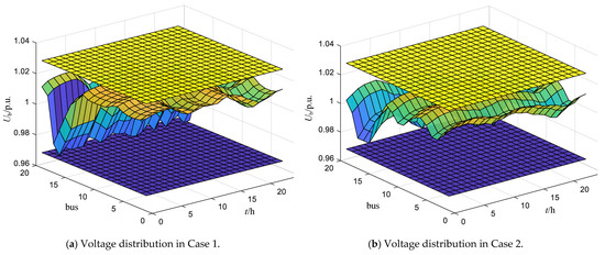 First, we present the voltage distribution of all nodes in the proposed ADN over a 24-h period for Case 1 and Case 2, as shown in Figure 17. The X-axis represents the ADN node numbers (0–19), the Y-axis represents time (0–24 h), and the Z-axis represents node voltage. The yellow plane above indicates the upper voltage limit (+3%), while the purple plane below represents the lower voltage limit (−3%). The curved surface in the middle shows the voltage distribution at different times for each node. It is evident that all node voltages remain within the voltage constraint range throughout all time periods without exceeding limits. This indicates that the proposed strategy effectively addresses the voltage violation issues in the network of RoR-SH.