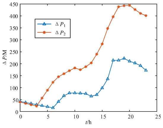 Next, calculate the difference in power and at the junctions of the two subnetworks with and without the wide-range TCSC in Case 1 and Case 2, as shown in Figure 18. It can be concluded that the power transmission efficiency of a line equipped with wide-range TCSC is always greater than that of a line without wide-range TCSC. This design offers obvious benefits for ADNs in mountainous areas, where lines are long and the environment is complex.