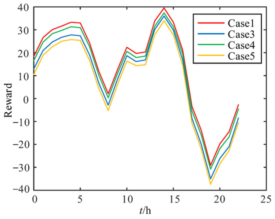 In order to verify the advantages of the proposed strategy in renewable energy consumption, reward values of Case 1, Case 3, Case 4, and, Case 5 for each action are compared over 24 h, as shown in Figure 19.
